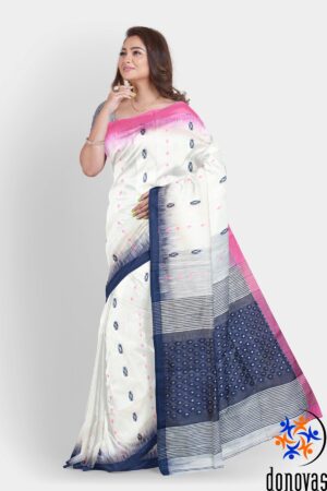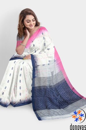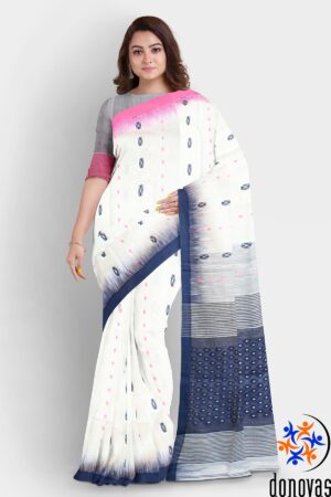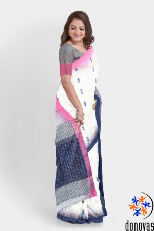 Elegant White Pink & Blue Handwoven Cotton Saree